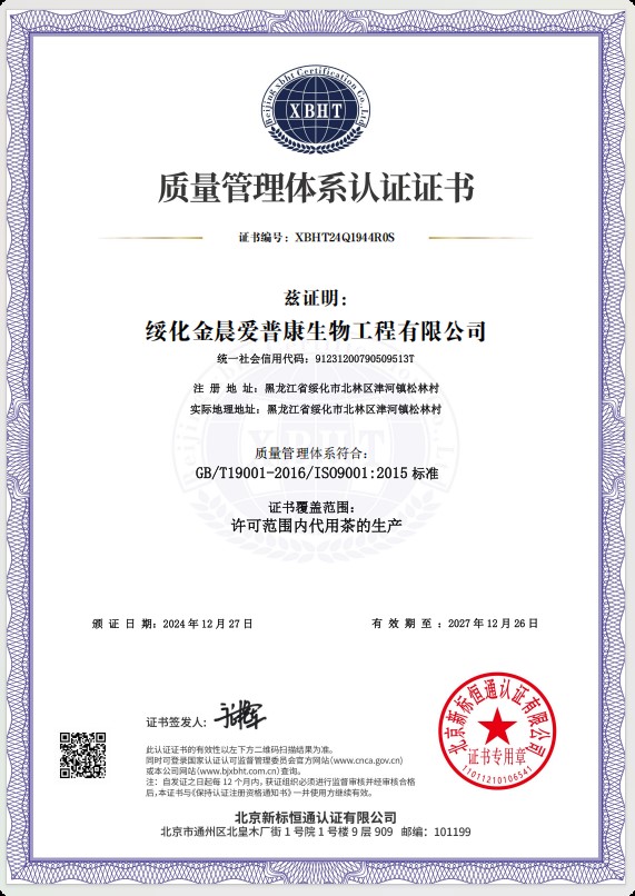綏化金晨愛(ài)普康生物工程有限公司位于黑龍江省中南部地區(qū)的綏化市北林區(qū),所處位置東經(jīng)124度,北緯45度,位于松嫩平原的呼蘭河流域,“有寒地黑土,塞北江南”的美譽(yù),是全國(guó)重要的商品糧基地,屬中溫帶大陸性季風(fēng)氣候,四季分明,雨熱同期,冬季冰雪覆蓋,夏季降雨集中氣候溫?zé)釢駶?rùn)。綏化金晨愛(ài)普康生物工程有限公司是一家專(zhuān)業(yè)從事健康養(yǎng)生產(chǎn)品研發(fā)、生產(chǎn)及銷(xiāo)售企業(yè),公司占地總面積8000平方米,建筑面積5000平方米,公司周?chē)鸁o(wú)任何污染源,是食品生產(chǎn)基地。公司生產(chǎn)車(chē)間潔凈度級(jí)別達(dá)到10萬(wàn)級(jí),同時(shí)擁有數(shù)十臺(tái)先進(jìn)的生產(chǎn)設(shè)備及高科技檢驗(yàn)儀器,從產(chǎn)品的原輔料、中間品、成品到銷(xiāo)售的全過(guò)程嚴(yán)格把關(guān),使生產(chǎn)中每道工序都符合產(chǎn)品的高標(biāo)準(zhǔn)要求,從而保證了公司生產(chǎn)的每一袋產(chǎn)品合格,無(wú)質(zhì)量缺陷。綏化金晨愛(ài)普康生物工程有限公司率先采用了企業(yè)資源ERP管理系統(tǒng),肩負(fù)著養(yǎng)生產(chǎn)業(yè)的重要課題,同時(shí)又是江蘇省國(guó)家藥用植物重點(diǎn)實(shí)驗(yàn)中心科研成果轉(zhuǎn)化的生產(chǎn)試驗(yàn)基地,公司核心成員均為本科以上學(xué)歷。生產(chǎn)的產(chǎn)品有近五十個(gè)品種的代用茶產(chǎn)品,公司先后通過(guò)HALAL國(guó)際認(rèn)證,編號(hào)為SSPY-201318-33849;ISO9001質(zhì)量管理體系認(rèn)證編號(hào)為XBH···